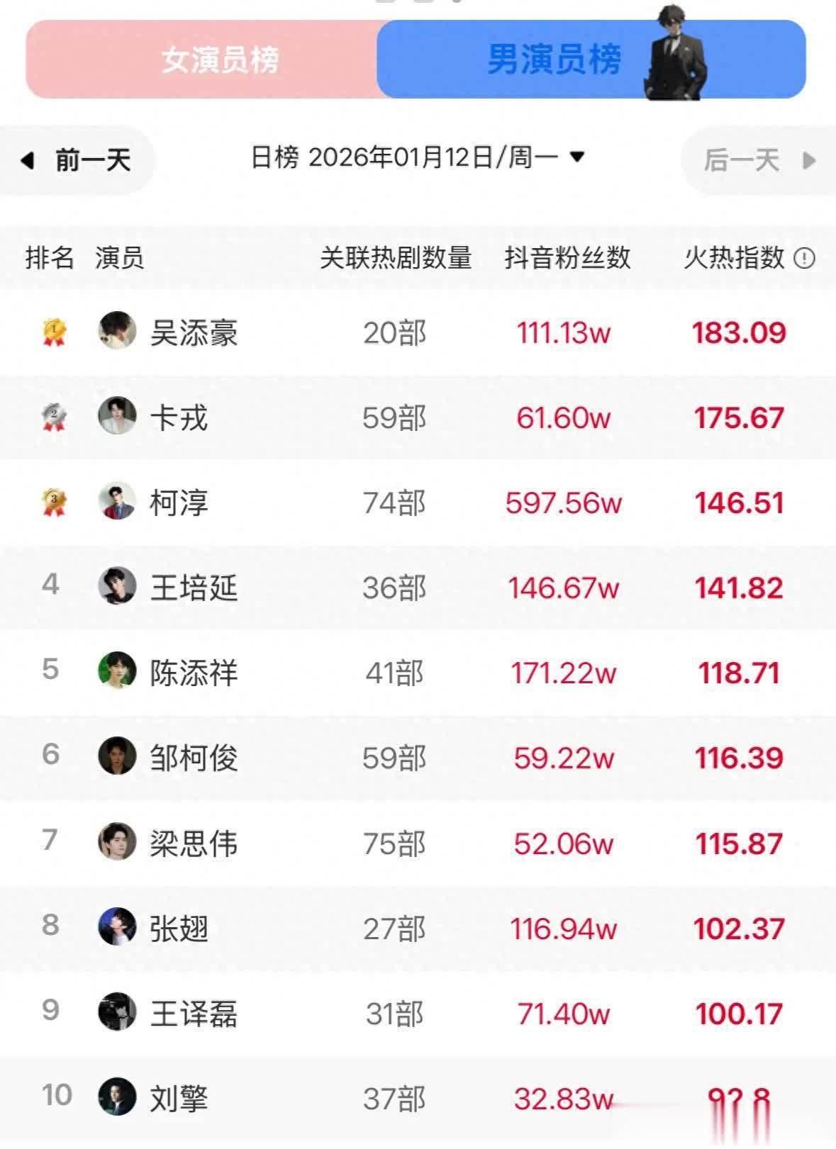 TOP1——吴添豪火热指数:183.09吴添豪二搭岳雨婷主演的《夜色撩人》正式官宣定档1月16日红果上线播出,饰演血族始祖“祁妄”,目前正在拍摄新剧《十八岁太奶奶4》,继续出演纪家老四“纪景川”一角,与陈添祥、王培延等人因片场搞笑互动被称"短剧圈活人"。